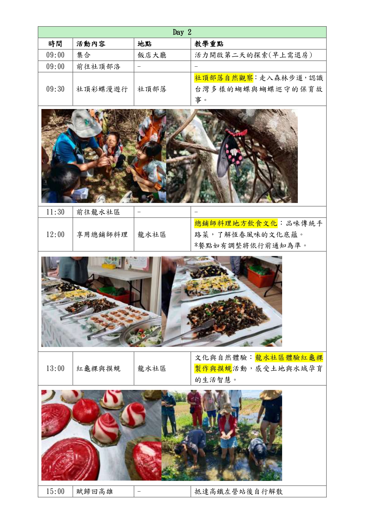 3.課程費用係為2人(親子家庭為主,小朋友年齡建議7~15歲,2位成人或樂齡亦可),含高雄高鐵站集合後的遊覽車、旅平險、住宿費、行程表中規劃的午餐及晚餐、DIY體驗費、活動體驗費等。