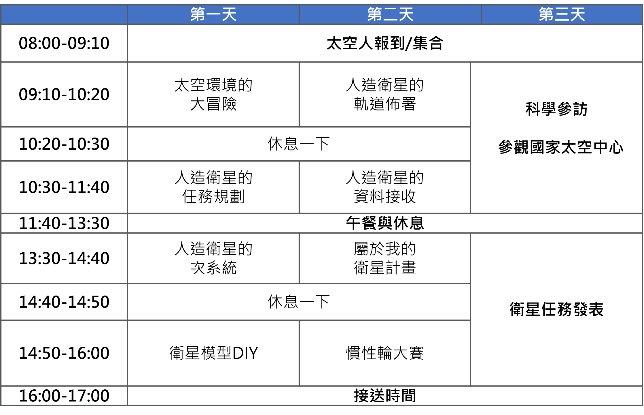 課程簡介:藉由課程讓參加的學員認識我國太空科技發展及衛星計畫,了解衛星的組成結構與運作,並培養學員思考完成自己的衛星任務。